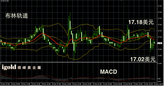 白银阴阳烛录得后期柱体低于红色日均线,短线MACD显示弱势空头主导,布林轨道区间下探。白银价格下午或不断测试17美元附近。