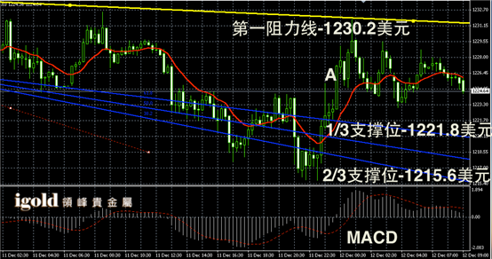 技术回顾:昨晚的评论中,我们提醒投资者注意1220美元支撑线,指出晚上金价会下探这一位置,跌破后会继续回落,这一预测与昨晚的趋势相符。