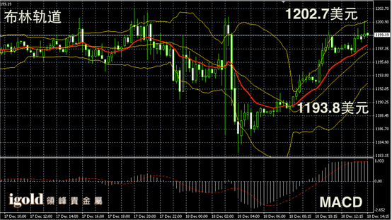 黄金阴阳烛录得柱体高于红色日均线,布林轨道区间上扬,短线MACD显示多头主导,黄金价格短线或首先在1198美元附近持稳,下午或不断冲击1200美元阻力线。