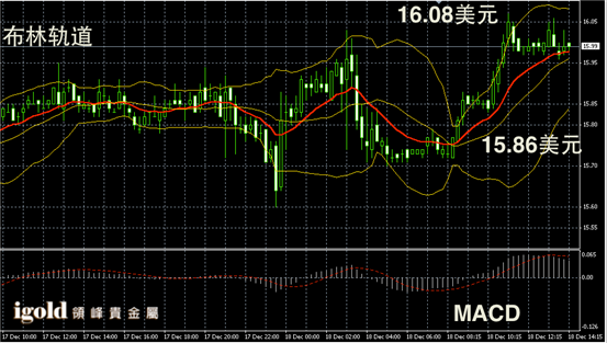 白银阴阳烛录得反弹后,末端柱体小幅回落,短线MACD显示多头主导,白银价格未能突破16美元,下午或在15.9美元附近盘整,美指若回落至88.8附近,白银价格或再次上探16美元。