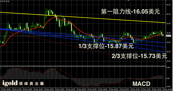 白银阴阳烛录得聚焦在红色日均线中位,短线MACD显示呈中性,白银价格晚上或继续浮动在15.9美元附近,短线白银价格的运行区间可参考15.85-16美元区间。