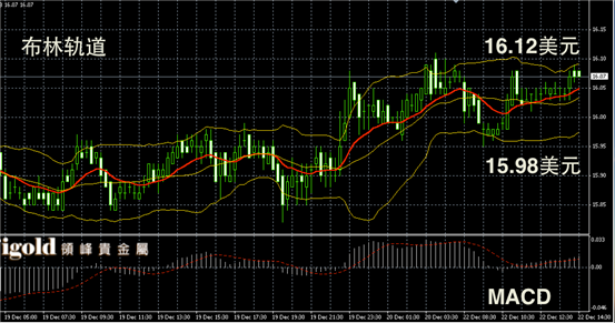 白银阴阳烛录得后期小幅上扬,布林轨道区间整体收平,短线MACD显示弱势多头,白银价格或围绕16.05美元进行整理,高位阻力可首先参考16.1美元。