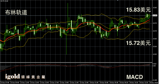 白银阴阳烛录得布林轨道区间上探,末端阳烛增多,短线MACD显示呈中性,白银价格或不断持稳15.8美元线。