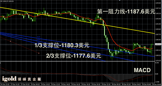 黄金阴阳烛录得下行后,末端阳烛回升,小幅高于红色日均线,短线MACD显示呈中性,黄金价格短线或逐渐回升至1186美元附近。