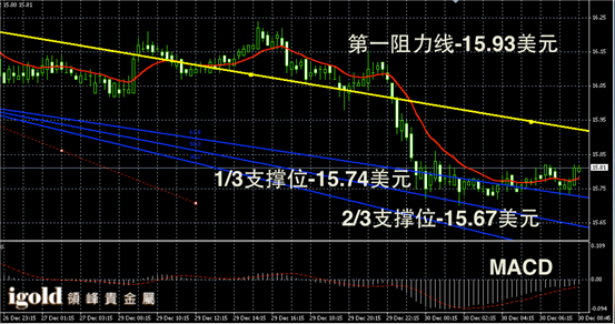 白银阴阳烛录得下跌后,市场持稳,末端阳烛小幅回升,短线MACD显示呈中性,白银价格短线或不断上探15.85美元附近。