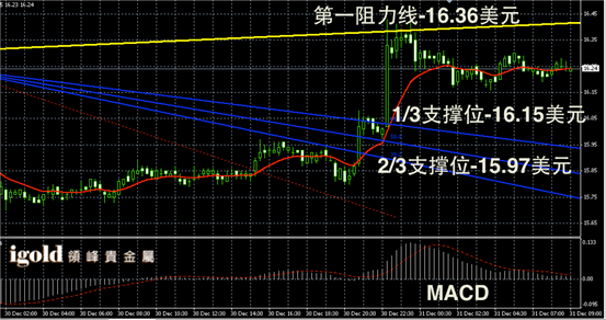 白银日线走势末端回落后,录得阳烛回升,且突破红色日均线。长线RSI录得50,有所回升,整体上多空均衡。小时线上白银价格突破16.2美元后,空头逐渐消散,短线市场或逐渐对这一支撑进行加固。