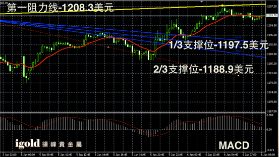 技术回顾:昨晚的评论中,我们提醒投资者以1193-1198美元为参考,跌破则会相应下探,突破阻力则会继续上升,这一预测与昨晚的走势相符。
