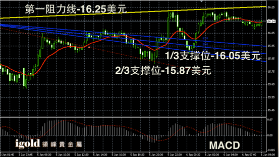 白银阴阳烛录得末端回调至红色日均线中位,短线MACD显示呈中性,白银价格短线回调已经结束,短线或在16.1美元附近持稳,随后可能再次上探至16.15美元附近。