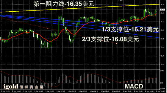 白银阴阳烛录得后期阳烛增多,且高于红色日均线,短线MACD显示多头主导,白银价格短线或不断持稳16.3美元,随后或再次上探16.35美元附近。