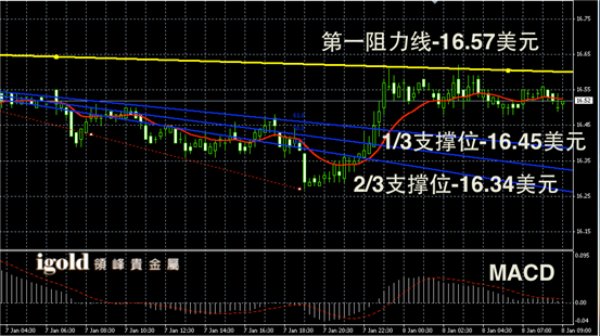 白银阴阳烛录得末端柱体收短,后期处于红色日均线中位,聚焦明显,短线MACD显示呈中性,白银价格或继续围绕16.5美元附近整理,白银价格或再次小幅上探16.57美元附近。