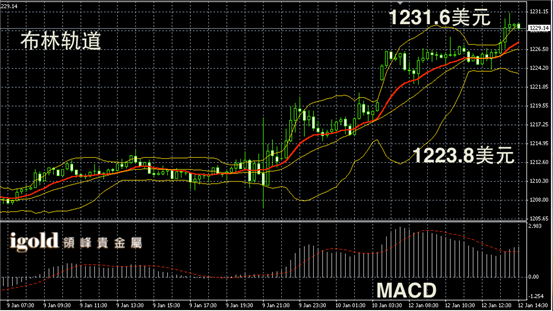 黄金阴阳烛录得反弹后末端录得阴烛,布林轨道区间收窄,短线MACD显示弱势多头主导,黄金价格午后或向1226美元附近回调,高位在突破1232美元前,不建议继续大幅做多。