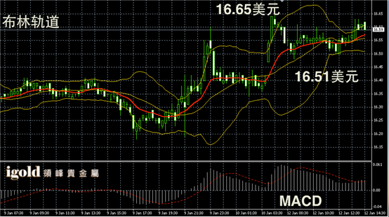 白银阴阳烛录得反弹后录得阴烛,后期布林轨道区间收平,短线MACD显示弱势多头主导,白银价格下午或在16.56美元附近徘徊。