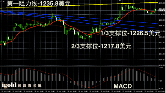 技术回顾:昨晚的评论中,我们提醒投资者留意低位支撑,并且指出金价会继续在1220-1230美元区间运行,这一预测与昨晚的趋势完全相符。且在高位阻力上,我们也给出了精确的预测。