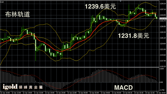黄金阴阳烛录得反弹后回落,后期阴烛低于红色日均线,布林轨道区间收窄,短线MACD显示弱势多头主导,下午市场或在1233美元附近持稳,整体运行区间可参考1230-1235美元,高位1237美元附近阻力较大,若突破或继续向1240美元附近突破。