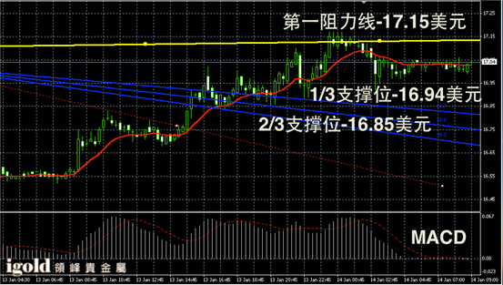 白银阴阳烛录得高位反弹后,柱体收短,整体持稳,短线MACD显示呈中性,白银价格横盘运行趋势明显,短线或继续围绕17美元附近盘整,并偏于向16.95美元附近回调。