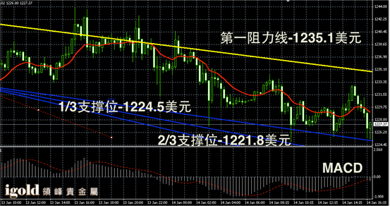 黄金阴阳烛录得后期阴烛增多,且柱体低于红色日均线,短线MACD显示呈中性,黄金价格建议进行波段操作,高位在未突破1230美元前不建议大幅做多,因为市场整体仍处于回调阶段。运行区间整体可关注1226-1232美元区间。低位支撑一旦跌破1224美元,跌幅或扩大至1221美元附近。