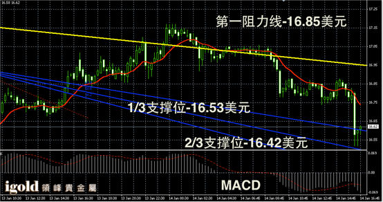 白银阴阳烛录得回调幅度非常大,末端阴烛大幅低于红色日均线,短线MACD显示空头主导,白银价格或小幅持稳在16.6美元附近。美盘时段,美指若回落,白银价格或会受助反弹,否则多头看涨意愿有所减弱,市场弱势偏空。低位若跌破16.55美元附近,或继续大幅滑落至16.43美元处。