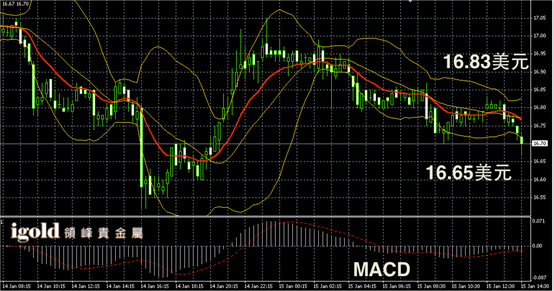 白银阴阳烛录得离散率增加,高低交叉于红色日均线,短线MACD显示弱势空头主导,布林轨道小幅收平。白银价格或向16.75美元附近回升,整体运行区间可参考16.7-16.84美元。