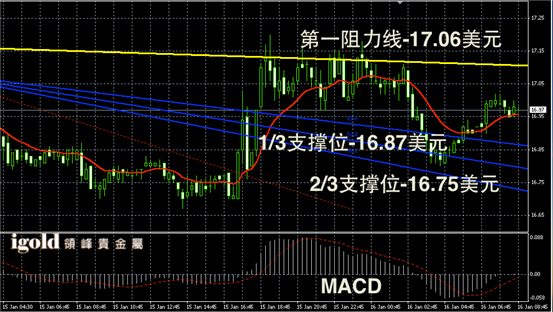 白银日线走势末端录得小幅上升,不过末端柱体收短,RSI录得61,仍在攀升。小时线上,波段震荡后末端录得红色日均线中位,白银价格日线区间可参考16.9-17.05美元附近。