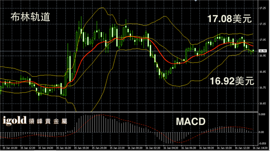 白银阴阳烛录得后期阴烛增多,且小幅低于红色日均线,短线MACD显示弱势空头主导,布林轨道小幅下探,白银价格此前形成了U型反弹,午后回调速度或放缓,市场或首先小幅下探16.9美元附近,随后偏于再次回升至17美元处。