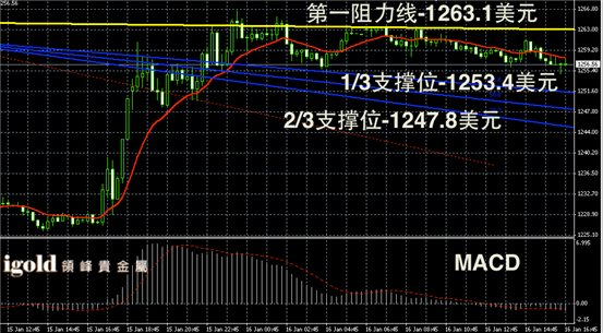黄金阴阳烛录得柱体收短,末端小幅低于红色日均线,短线MACD显示弱势空头主导,金价目前运行幅度较小,预期美盘时段或有新的动向,低位支撑首先关注1255美元,跌破或向1247美元附近滑落,高位若突破1261美元,可小幅看涨。