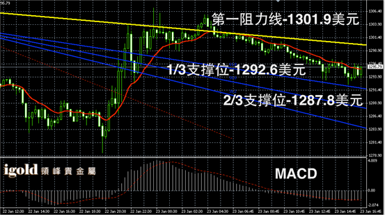 黄金阴阳烛录得小幅低于红色日均线,短线MACD显示弱势空头主导,短线金价在突破1298美元前,不建议大幅做多,低位若跌破1293美元,回调幅度或扩大至1288美元附近。