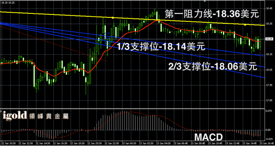 白银阴阳烛录得后期阴烛增多,且处于红色日均低位,短线MACD显示弱势空头主导,白银价格晚上或继续小幅回调,低位建议参考18.15美元,若跌破或继续下行至18.06美元附近,高位突破18.3美元前多头仍然较弱。