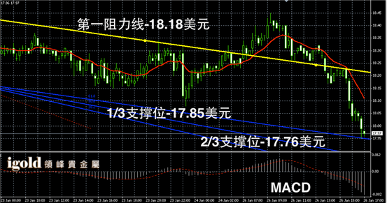 白银阴阳烛录得回落趋势明显,短线MACD显示空头主导,晚上短线若未能回升至18美元以上,或继续向17.83美元附近滑落,低位支撑可分阶段参考17.7美元和17.63美元。