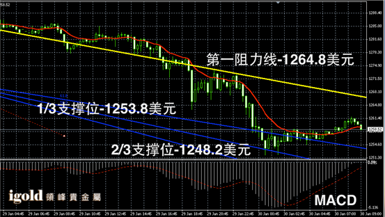 黄金阴阳烛录得柱体回落后,末端柱体收短,整体处于红色日均线中位,短线MACD显示呈中性,黄金金价短线或在1258美元附近持稳,并且偏于回升至1260美元附近,高位若突破1262美元,可进一步看涨。