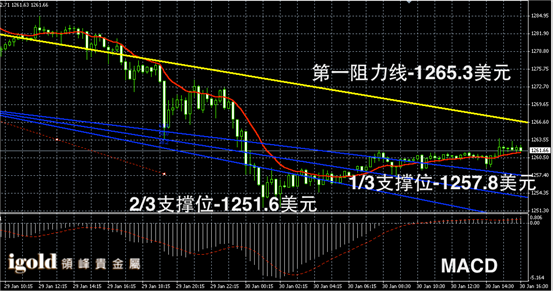 黄金阴阳烛录得柱体较短,后期小幅回升至红色日均线中位,短线MACD显示呈中性,目前金价多头不足,突破1263美元前或继续盘整,美盘时段,留意1257美元和1253美元附近支撑,若跌破空头或扩大。