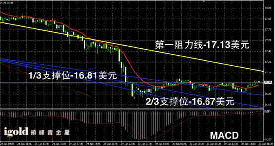 白银阴阳烛录得后期小幅高于红色日均线,但是整体柱体较短,短线MACD显示呈中性,白银价格持稳16.9美元后偏于向17美元附近靠拢。美国GDP数据发布前后留意空头反击,低位支撑可分阶段参考16.8美元和16.72美元。