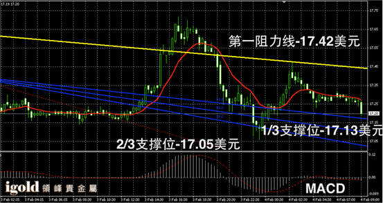 白银阴阳烛录得后期阴烛回落,且低于红色日均线,短线MACD显示呈中性,白银价格上午或在17.2美元附近持稳后向17.26美元附近回升。