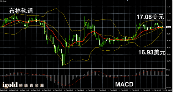 白银阴阳烛录得柱体较短,阴阳烛间隔出现,整体处于红色日均线中位,短线MACD显示弱势多头主导,白银价格或不断持稳17美元附近,高位若突破17.05美元,多头态势或扩大,否则或继续在16.96美元附近横盘运行。