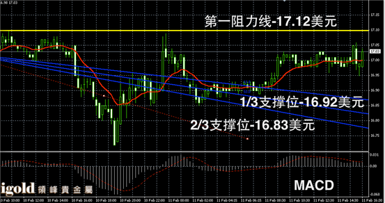 白银阴阳烛录得柱体聚焦在红色日均线中位,短线MACD显示弱势多头主导,白银价格短线或继续持稳17美元,若突破17.05美元,或逐渐上探至17.12美元附近。