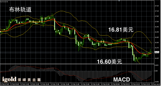 白银阴阳烛录得小幅回升,后期处于红色日均线中位,布林轨道小幅下探,白银价格午后若不能突破16.75美元,或再次下探16.62美元附近。