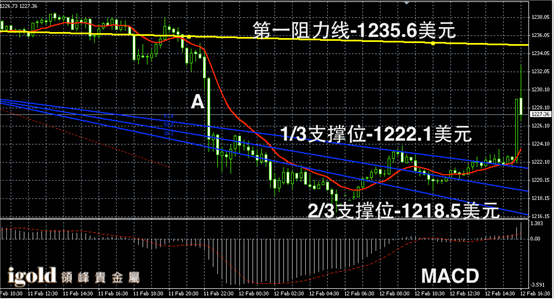 黄金阴阳烛录得后期阳烛回升,整体高于红色日均线,短线MACD显示弱势多头主导,黄金价格短线形成了U型反弹,短线或在阴烛A的高低价区间运行。高位若突破1234美元,或继续上探至1237美元附近,低位支撑可首先参考1222美元附近。