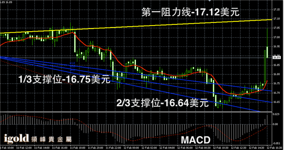 白银阴阳烛录得末端阳烛回升,短线MACD显示弱势多头主导,白银价格或在16.75-17美元区间运行,短线可在此区间进行区间操作,若突破16.95美元或继续上探17.05美元附近。低位若探破16.75美元,空头或大幅增加。