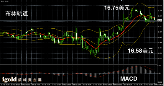 白银阴阳烛录得阴阳烛间隔出现,整体处于红色日均线中位,布林轨道区间收平,短线MACD显示弱势多头主导,白银价格或继续在16.65美元附近横盘运行,短线运行区间可参考16.55-16.75美元区间。