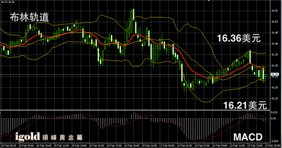 白银阴阳烛录得阴阳烛间隔出现,末端柱体低于红色日均线,短线MACD显示弱势空头主导,白银价格或持稳16.25美元后,偏于上探16.32美元附近,低位支撑可首先参考16.2美元附近。