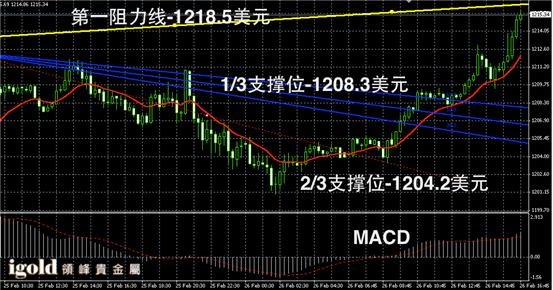 黄金阴阳烛录得末端阳烛大幅增加,且明显高于红色日均线,在有效突破1212美元后多头增加,短线MACD显示多头主导,金价晚上8点前或小幅回落持稳在1214美元附近,随后等待美指指引,若再次突破持稳1215美元,或继续上升至1218美元附近,低位阻力可分阶段参考1211和1207美元附近。