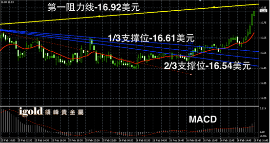 白银阴阳烛录得后期阳烛连续增加,且大幅高于红色日均线,短线MACD显示多头主导,白银价格或首先回落至16.8美元附近横盘运行,晚上8点前后或再次上探16.85美元,美指若回升,白银价格或分阶段下探16.7和16.62美元附近支撑。