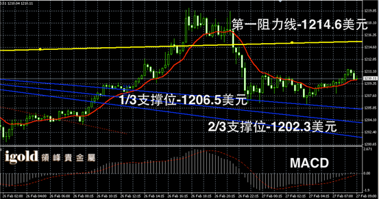 技术回顾:昨晚的评论中,我们指出金价会首先持稳1214美元,突破1215美元会上升至1218美元附近,并且明确指出晚上8点左右美指攀升后,金价会承压下行,这些预测与昨晚的走势完全一致。