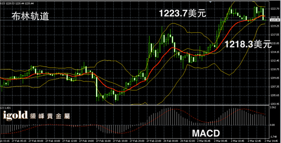 黄金阴阳烛录得反后,阴增多,末端柱体回落至红色日均线中位,布林轨道区间收平,短线MACD显示多头主导,午后金价或小幅回调,或围绕1220美元附近进行盘整,低位若突破1219美元,或向1217美元附近滑落。高位若突破1223美元,或看涨至1225美元附近。