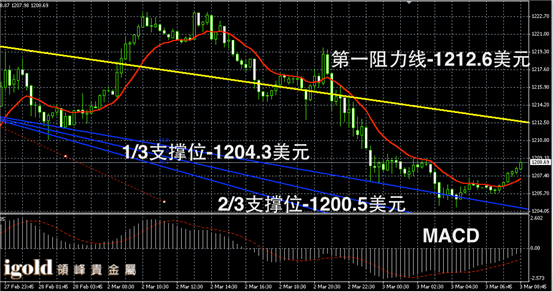 黄金阴阳烛录得阴回落后,末端阳增多,且柱体高于色日均线,短线MACD示空减弱,黄金价格上午或向1211美元附近回升,低位支撑可首先参考1207美元附近。