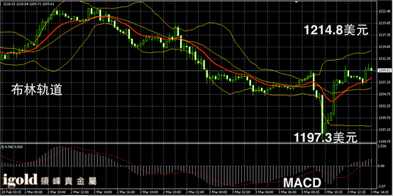 黄金阴阳烛录得短线高低震荡趋势明显,后期阳烛回升,高于红色日均线,布林轨道录得区间扩大,黄金价格午后或首先在1208美元附近盘整,随后或偏于向1211美元附近上探,低位支撑仍然首先参考1207美元,一旦跌破空头或扩大。