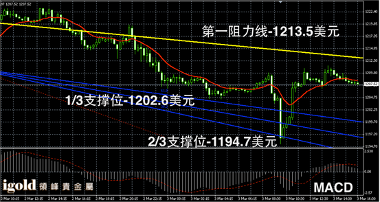 黄金阴阳烛录得震荡后柱体收短,后期聚焦明显,且处于红色日均线中位,短线MACD显示呈中性,黄金价格晚上或在1208美元附近盘整,晚上8点之后,再跟随美元指数进行逆向波动,高位若突破1212美元,或再次上探至1215美元附近,低位支撑可分阶段参考1207和1204美元附近。