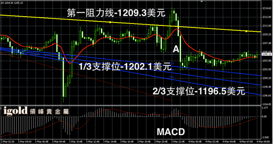 黄金阴阳烛录得下行后,末端阳烛小幅回升,聚焦在红色日均线中位,短线MACD显示呈中性,黄金价格上午或在阴烛A的范围内小幅上探,突破1207美元前不建议大幅做多。