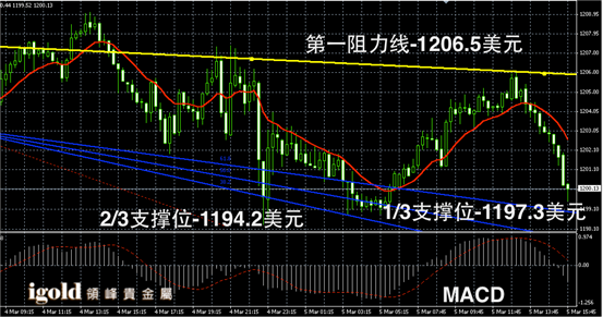 黄金阴阳线录阴烛增多,后期低于红色日均线,短线MACD显示呈中性,黄金价格建议参考1199美元附近支撑,若跌破空头或扩大至1195美元附近,高位若重回1204美元附近,或持稳。