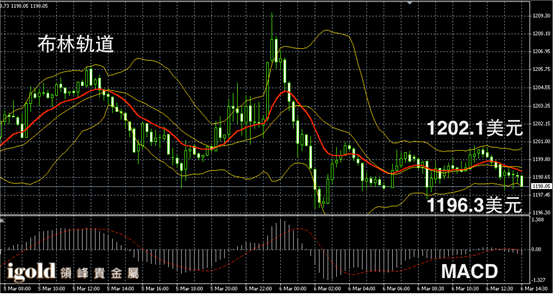 黄金阴阳烛录得末端柱体低于色日均线,阴小幅增多,短线MACD示呈中性,布林道区收平,黄金价格午后或在1198美元附近继续偏空运行,低位支撑可首先参考1196美元,高位若重回1202美元,可小幅看