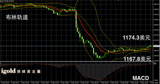 黄金阴阳烛录得阳烛回升,末端柱体高于红色日均线,短线MACD显示空头减弱,布林轨道区间小幅上探,金价午后或仍有部分反弹空间,整体偏于上探1174美元附近,若有突破或继续看涨至1175.6美元附近。低位支撑可首先参考1169美元附近。
